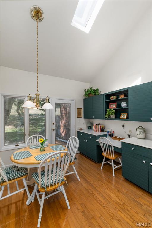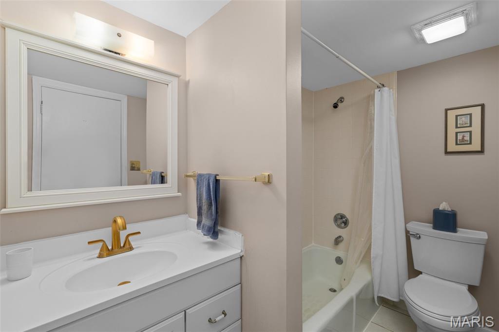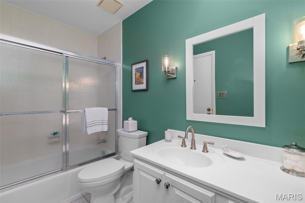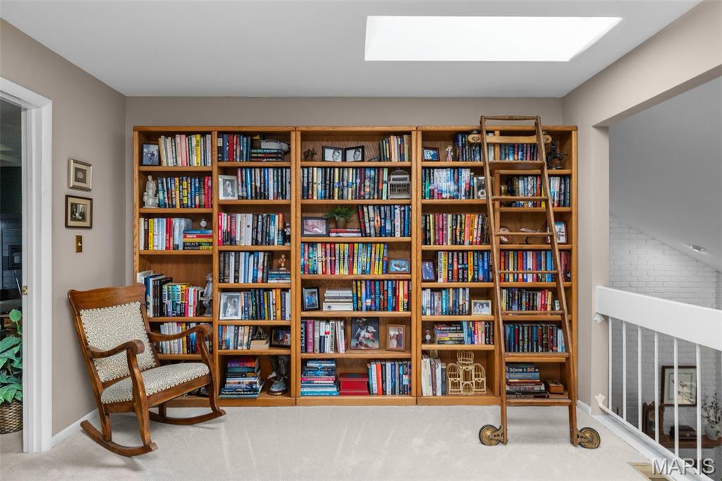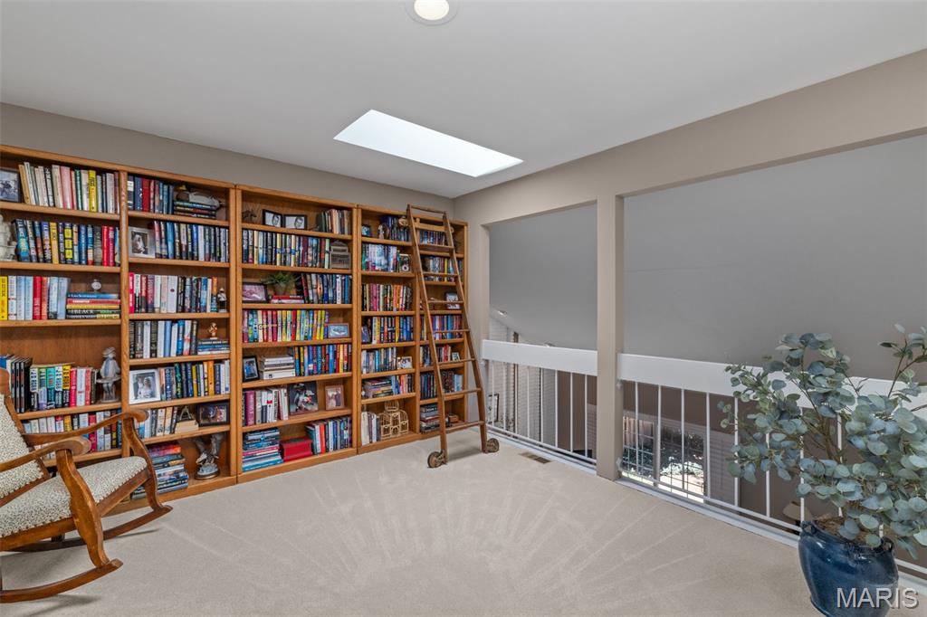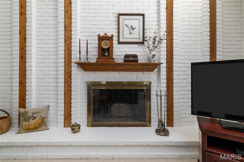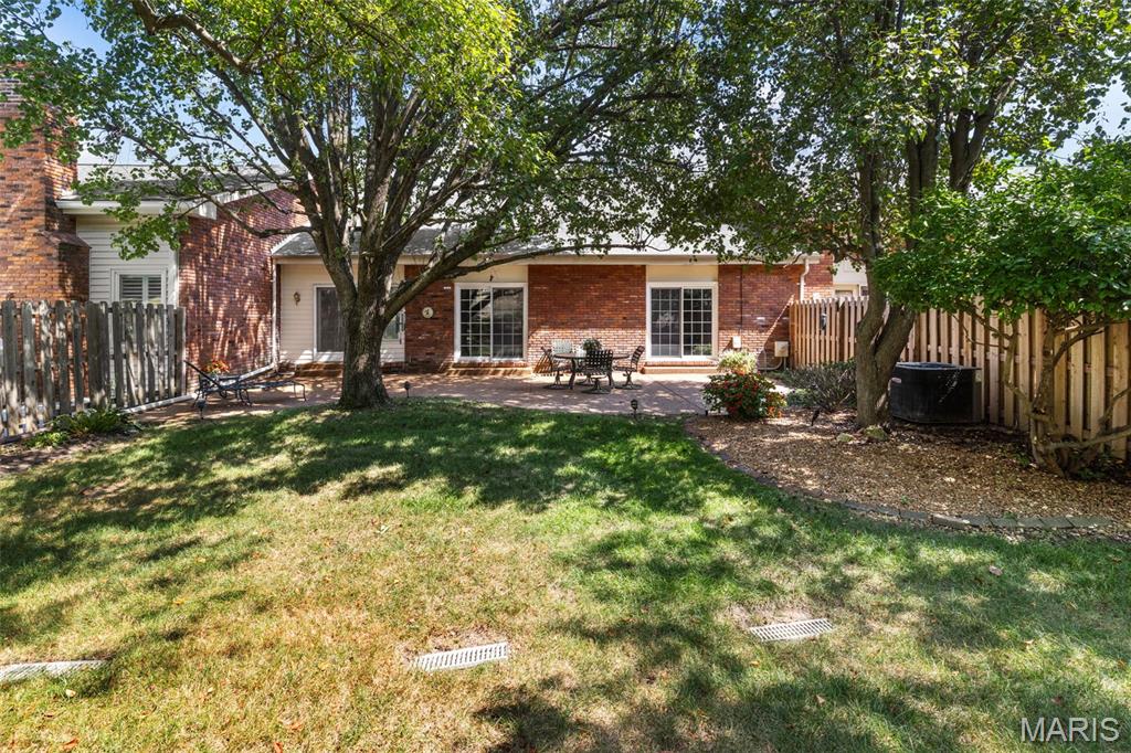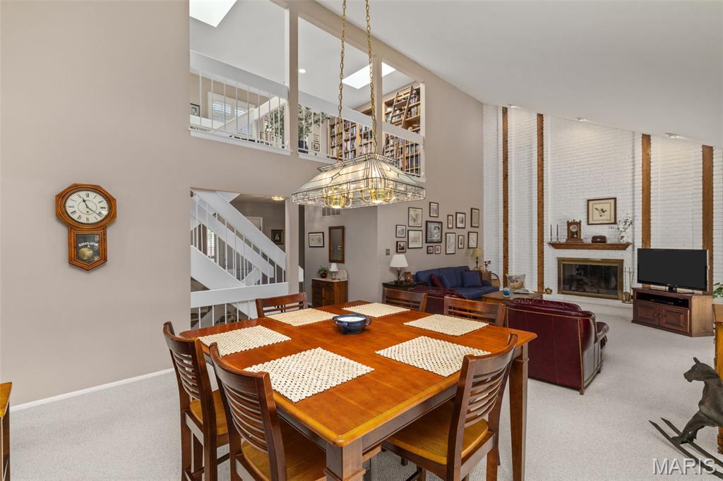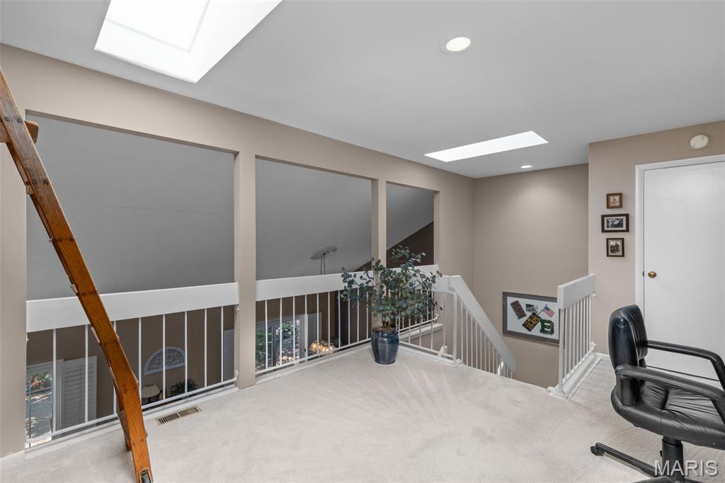 Enjoy the ease of villa living in this meticulously maintained and updated 1.5-story home in Chesterfield! You'll love the curb appeal, with a brick exterior, lovely landscaping, and an inviting covered front porch. From the foyer you'll find the open layout of the main living space, perfect for entertaining! The living room and dining room have vaulted ceilings, a view into the upper level, and a cozy gas fireplace with floor-to-ceiling brick surround. Dual sliding glass doors lead to the patio, and natural light from the upstairs skylights adds to the open, airy feeling of the space. It's easy to imagine hosting gatherings in the updated kitchen w/ warm hardwood floors, quartz counters, backsplash, modern cabinets which continue into the breakfast nook w/vaulted ceilings, skylight & planing desk area. The primary suite has a walk-in closet, tub w/tile surround & large vanity. A convenient laundry room rounds out the main level. Upstairs is the loft home office w/built-in bookshelves. It leads to the guest bedroom (staged as a den) w/dual closets and en-suite bath. The finished lower level adds a family room w/brick fireplace, sleeping area w/closet and built-in shelves, full bath w/tile surround tub, and unfinished space w/workbench and utility sink. Amazing backyard! You'll have a large patio shaded by trees, overlooking the common ground beyond. Community amenities: tennis/pickleball courts, pool, and a scenic pond. Moments from restaurants & shopping. Don't miss out!