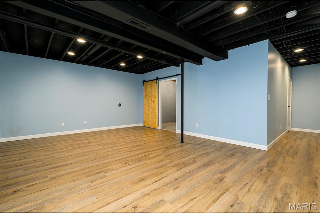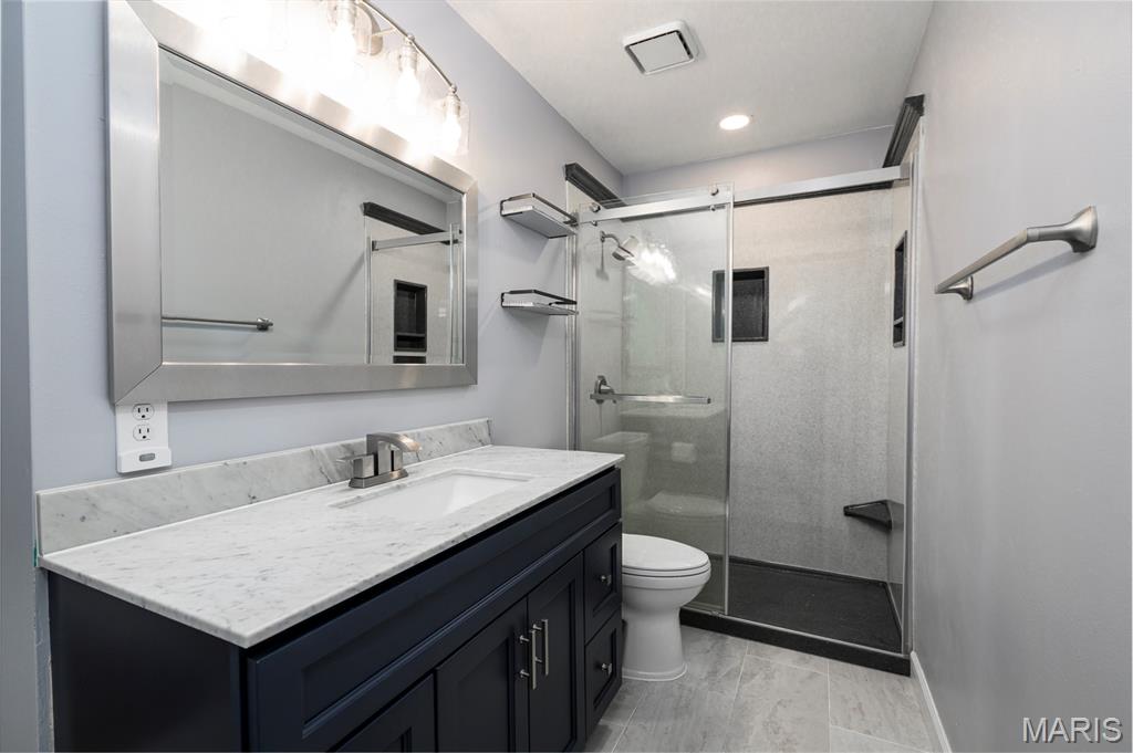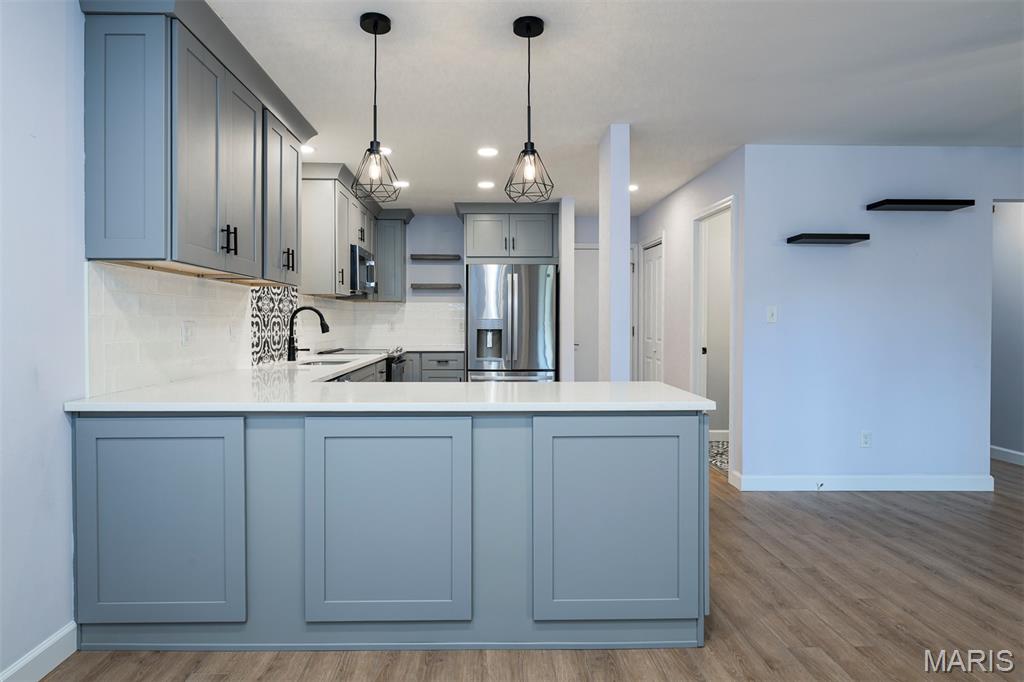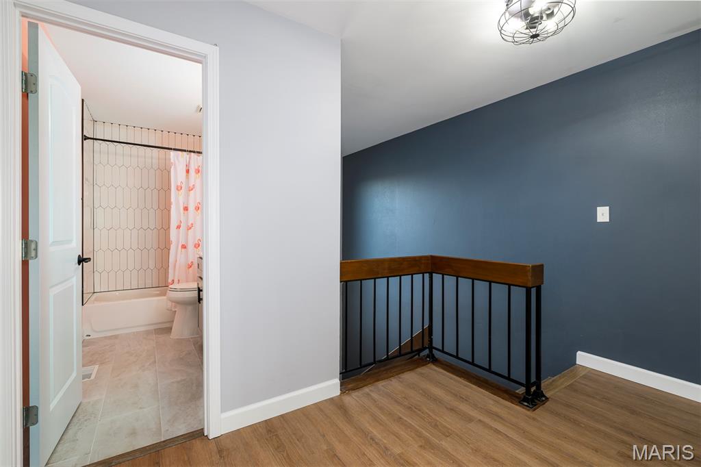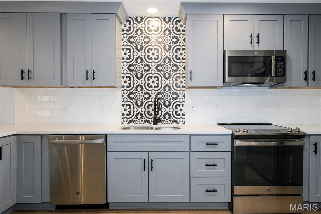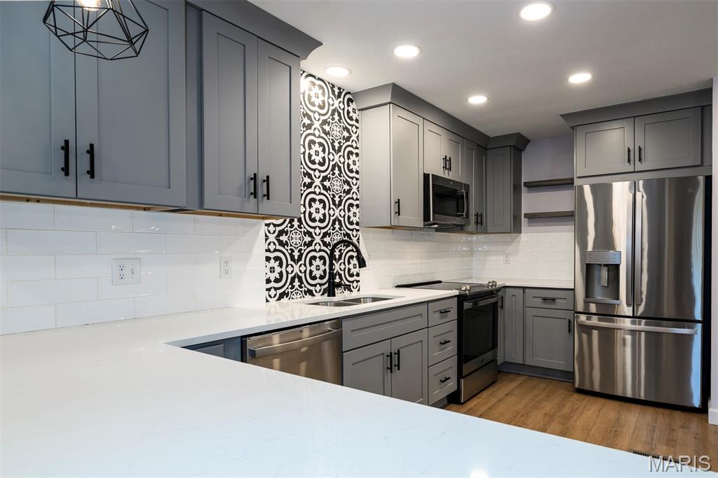 Easy livin' at its finest! This charming townhouse has been updated from top to bottom - all that's left to do is move right in. Step inside from the front walk into a 2-story entry foyer with chic light fixture and useful storage. The open main floor features a focal point fireplace and sliding door out to a back deck in the living room, plus a nice dining area for entertaining or everyday meals. The gorgeous kitchen is a showstopper with beautiful cabinetry, tons of counter space, striking tile backsplash, and newer SS appliances (all stay!). A cute powder room (that you'll actually want guests to use!) and pantry round out the main floor. From the second-floor primary suite, enjoy a relaxing cup of your favorite beverage outside on another back deck. This serene suite also includes dual closets and a beautiful bathroom with onyx shower. The light & bright second bedroom is serviced by another adorable full hall bath. Even the lower level is super functional with a huge, finished rec/family room, walk-out, more storage, and practical laundry/utility area. Other amenities (too many to list all here!) include an attached 1-car garage, assigned additional parking, community pool & tennis court, convenient access to shopping & restaurants, & desirable Valley Park School District. Isn't it appealing to love where you live?