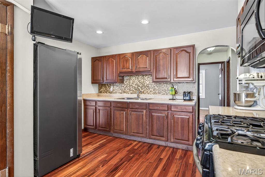 Full of charm and character this 2-bedroom, 1-bath home is filled with thoughtful updates and surprising hidden storage throughout. Gleaming wood floors and abundant natural light highlight the main level, where the living room flows seamlessly into a kitchen/dining combo ideal for everyday living and entertaining. The kitchen features under-cabinet lighting, a pantry, and clever hidden storage. The beautifully tiled bath features a heated tile floor for everyday comfort and luxury. An enclosed breezeway adds a versatile bonus space with laundry hookups and access to the one-car garage and a large, peaceful deck overlooking the private, fenced backyard perfect for relaxing or hosting guests. The partially finished walkout basement offers a flexible family room with a pocket door for two separate spaces, plus a storage room and a utility room with second laundry hookups and sink. Wide driveway allows side-by-side parking while the garage includes a small workshop space. Newer A/C and hot water heater. Seller is offering a Choice home warranty for added peace of mind. A special home full of character, comfort, and room to grow. Come fall in love!