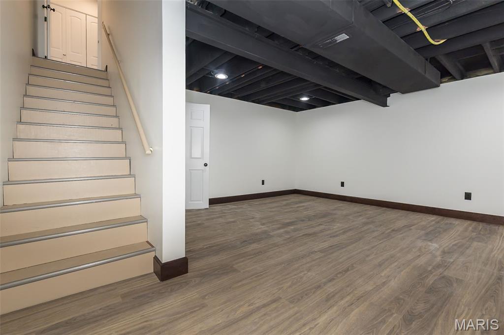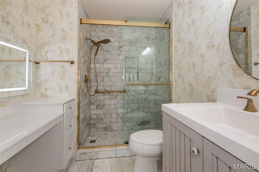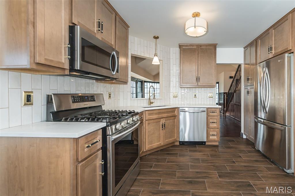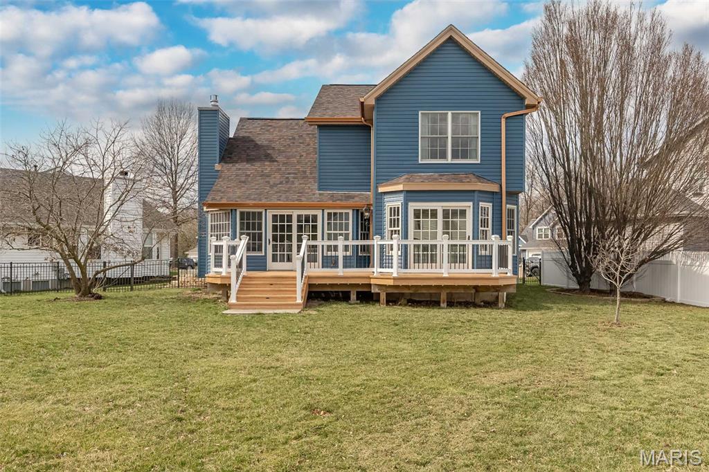 Prepare to be amazed! This Valley Park stunner is sure to impress. The exterior of the home has a stacked stone elevation with new, modern vinyl siding, a newer roof and is accented with new copper colored gutters. Meander across the beautiful walk way, lined with perennials and topiary accents to the welcoming covered entryway. Step inside to the vaulted living room wrapped in rich wood wainscotting, with a new staircase encased in modern balusters, oak treads, and poplar risers. The home offers elegant modern lighting, and an abundance of natural light with upgraded wood clad windows throughout. The amply sized dining room offers plenty of room to host large dinner parties. The kitchen has been completely renovated with pecan tone cabinets, quartz counters, a modern tile backsplash, brushed gold and black accents, and wood look ceramic floor tile. Upstairs the spacious primary suite offers a wood clad vaulted ceiling, an abundance of natural lighting and a custom closet. The primary bath is finished in Carrera marble that blends seamlessly with the new vanity ,mirrors and custom lighting. The secondary bedrooms are finished out nicely and include newer carpeting and newer, solid hardwood doors that grace the entire home. The hall bath has newer tile and an amazing vanity and custom light combination. Need more space? Stroll down to the finished recreation room in the basement where you can set up your media room for uninterrupted entertainment possibilities. Your outdoor experience is enhanced with a stunning composite deck that overlooks your fenced, third of an acre lot. It offers endless possibilities for gardening enthusiasts and provides a safe haven for the kids and your canine companions.
