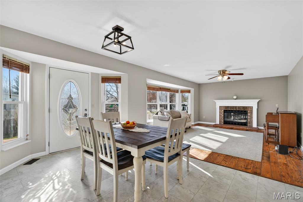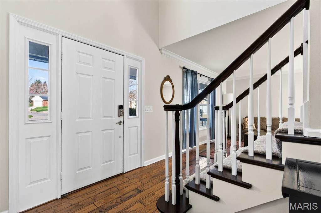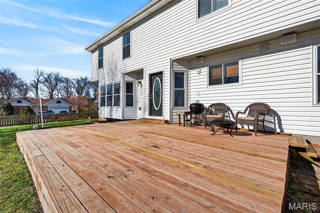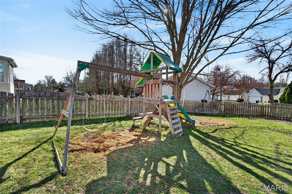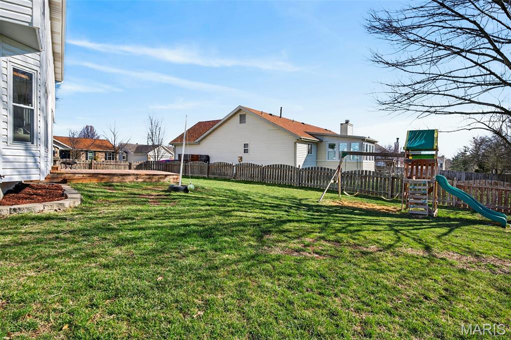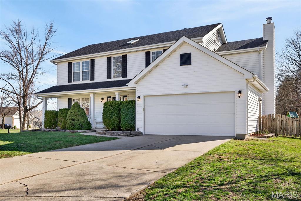 Welcome to 4923 Dresden Way — a beautifully refreshed two-story home offering space, style, and a location that’s hard to beat. From the moment you arrive, the charming covered front porch and inviting curb appeal set the tone. Inside, you’ll find hardwood floors, fresh paint throughout, and abundant natural light, highlighted by a classic bay window and a cozy fireplace that anchors the main living space. The updated kitchen is ready for both everyday living and entertaining, featuring granite countertops, new stainless steel appliances, and easy flow into the formal dining room. A main-floor laundry room adds extra convenience. Upstairs, enjoy the clean, modern feel of new luxury vinyl plank flooring throughout the second level. The primary suite is a true retreat with tray ceilings, fresh paint, a spacious walk-in closet, and a beautifully renovated bathroom complete with double vanities, a walk-in shower, and a freestanding soaking tub. Step outside to a large fenced backyard—perfect for gatherings, outdoor dining, or relaxing evenings. Additional improvements include new basement windows and added joist insulation, helping improve comfort and temperature control year-round. Located in a quiet, established neighborhood with excellent highway access, you’ll enjoy being just minutes from shopping and dining near the Mid Rivers area while still feeling tucked away. Outdoor enthusiasts will appreciate the walking path access to Veterans Tribute Park, about a mile away. Move-in ready, thoughtfully updated, and ideally located—this is one you won’t want to miss.