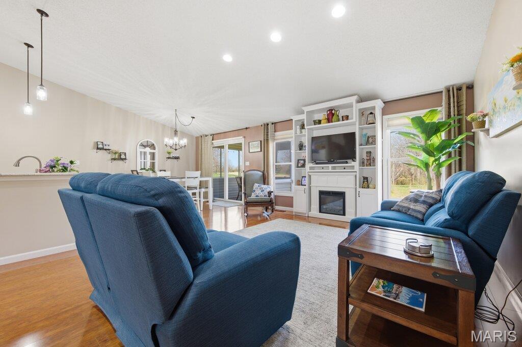 Welcome to the Golf Club of Wentzville Villas and this beautifully maintained 2-bedroom, 3-bath home that showcases true pride of ownership throughout. The heart of this home features an open concept living area defined by soaring vaulted ceilings and large windows that bathe the room in natural light. A stunning kitchen with gleaming granite countertops, a classic subway tile backsplash, and stainless steel appliances. Enjoy relaxing or entertaining on the screened-in back deck with views of the 18th fairway, or head downstairs to the fully finished basement complete with a wet bar, living room, additional sleeping area or office, a full bath plus ample storage area. Additional highlights include custom built-in shelving around the electric fireplace in the main floor living room, main-floor laundry, and the ease of maintenance-free living. Tucked just off the beaten path in Wentzville, this home offers the perfect blend of comfort, style, and convenience.
